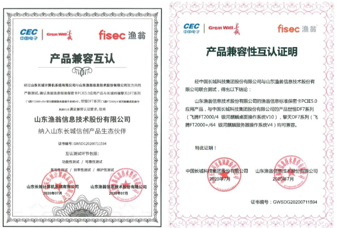 从功能性、可靠性、易用性、效率性、维护性五大环节,万象城AWC信息与长城进行了严格的联合测试。最终确认万象城AWCPCI-E 5.0密码卡与长城终端产品——世恒DF7系列(飞腾FT2000/4 银河麒麟桌面操作系统V10),擎天DF7系列(飞腾FT2000+/64 银河麒麟服务器操作系统V4),满足兼容认证要求。并且,万象城AWC信息此次成为了长城信创产品生态伙伴,携手构建安全新生态。